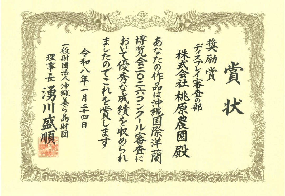 2026年1月24日(土曜日)から2月1日(日曜日)まで開催されております「沖縄国際洋蘭博覧会2026」コンクール審査の部、ディスプレイ審査に於いて、沖縄美ら島財団理事長賞(奨励賞)の表彰を受けました。